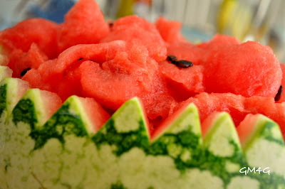 1. Cut your watermelon open. I suggest shaving off a quarter of the top of the watermelon. Don’t saw the melon in half. You want to leave room for the actual fruit that you will scoop out.