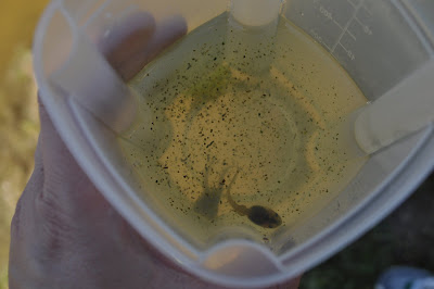 See the little brown speck in the middle? That is our tadpole. Two of the tadpoles immediately explored their new habitat. However, the leggy one decided to nibble on the floating algae. They were excited about their new home. The realities of pond life floated close by.