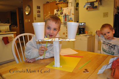 Much to my delight, I returned home to find out that they boys had indeed completed their challenge of constructing a cup holder for this past week’s Instant Challenge (over at Delightful Learning).