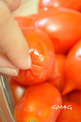 Take your red fruit (yes, it is a fruit because it has a seed!) and gently slice an X at the base of the tomato. You want to just break the tomato’s skin.