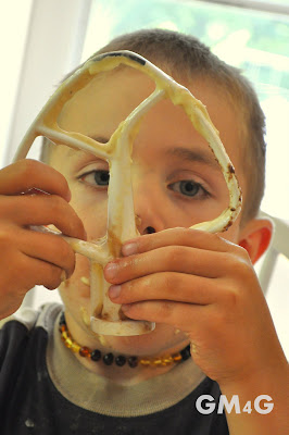 The Birthday Boy and Mr. Me-Too worked on decorating party favor bags while Hottie Hubby worked in the yard and I baked a cake.