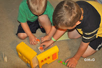 Soon, Mr. Me-Too clomped down the stairs and was DELIGHTED to discover a toy bus. Now you have to understand that our subdivision sounds like a race track for buses. Of a school morning, it isn’t uncommon to see 15+ buses. I think the fact that the boys most likely won’t ever ride a yellow bus to school, makes buses all the more enticing.