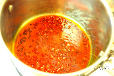 3. Saute annatto seeds in oil for several minutes or until the oil turns yellow. Remove seeds with a slotted spoon or any other creative method you may have for straining.