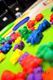 Counting Bears are always a big hit. It can be hard to distinguish the red from the orange in our set! The cards we used work on following patterns and completing the pattern.