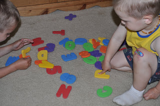 And to wrap it up, today we confiscated Mr. Smiley’s bath time alphabet toys and put the letters in alphabetical order.