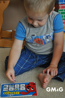 I often incorporate FIAR (Five In A Row) materials. This week we read ABC Bunny. Mr. Me-Too was to move the beads on the abacus each time we saw a bunny in the story. I really thought that he wouldn’t wait for us, but move all of the beads ove before the rabbits were counted. However, he showed great self-control and ONLY moved a bead if I said a number. Way to go, Mr. Me-Too!