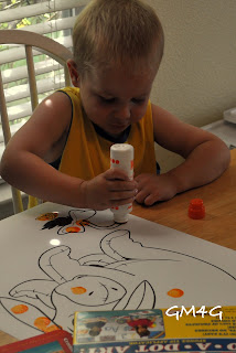 Using some foam stickers from Oriental Trading, Mr. Me-Too was given the freedom to make his own picture.  I like using stickers like these because it requires little fingers to practice fine motor skills.