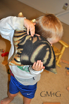 The boys always see me sew. So I decided to have them sew something or be involved in a sewing project. I stitched some pre-designed animal pillows together and they stuffed their pillows. This really worked their fine and gross motor skills. I think this will be a project that we repeat. They struggled with it at first. It was difficult because they couldn’t visualize what they were really doing by stuffing the pillow. It just seems like an endless task! Mr. Me-Too made Lady the Cat, and Mr. Smackdown stuffed Matthew the Fire Dog.