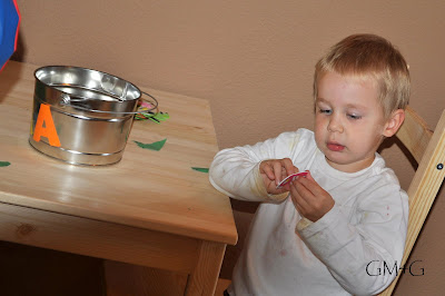 I have been collecting bottle caps for several months now. Why? I’m not sure. I just know that Carisa uses them for Tot School. Using tongs the boys had to take the caps out of the coconut oil tub and into their own buckets.