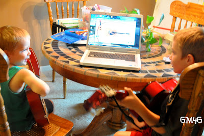 And I broke down and bought some help. I know nothing about music. Even when the Hottie Hubby has attempted to explain music to me . . . it falls on deaf ears. I couldn’t even master the recorder in grade school. I can’t even pound a djembe to the right beat. So, I found this great little guitar program for beginners for the computer. I am proud to say that the boys and I know the chord g!!!!!! I am so excited!