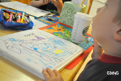 We also started Carisa’s new ABC Farm lapbook. However, I don’t have a picture of us interacting with it. Hmmm . . . but here are the boys sipping Starbucks (white milk) with Mama on her weekly visit. These printables are from ABC Teach.