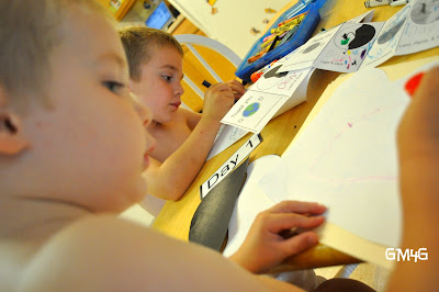There are a few bloggers whose writings I have delivered to my in box, instant inspiration. One such inspiration came from Valerie (Lapbook Lessons) thru Carisa (Tot School). The timing of her lapbook lesson update was perfect. For AWANA last Wednesday, Mr. Me-Too’s memory verse was Genesis 1:1, “God created the heavens and the earth.” So, we created a Creation Lapbook!